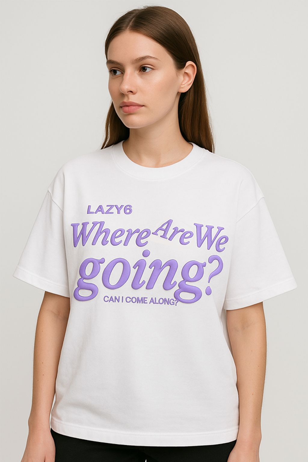 *“Where Are We Going? Can I Come Along?”* — is paired with the *Lazy6* branding, giving the t-shirt both visual appeal and emotional depth. Whether you’re heading out for the day or just want to make a quiet statement, this tee blends comfort with conversation.