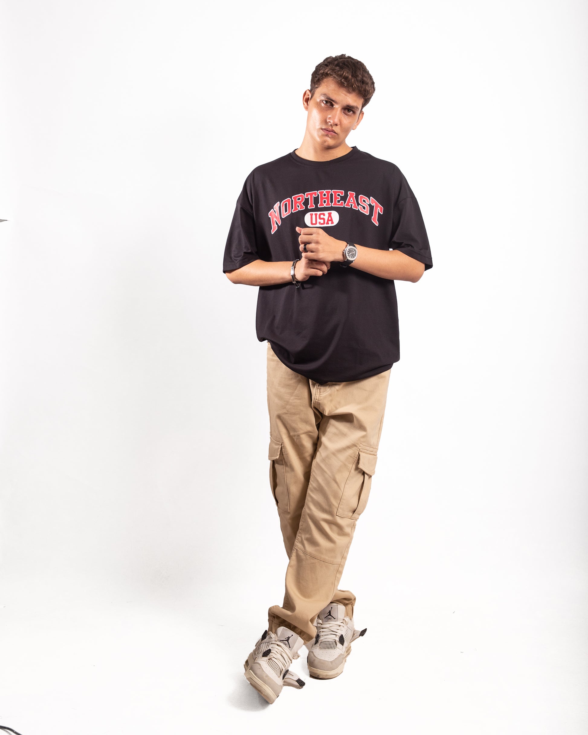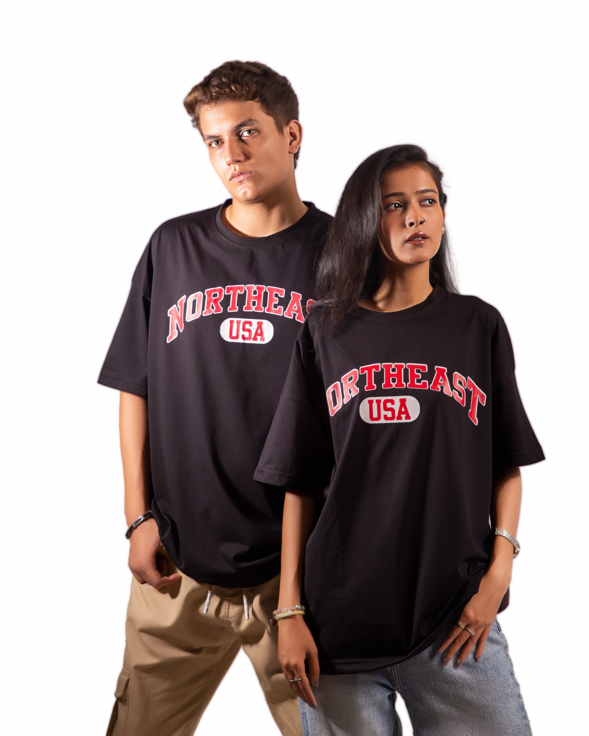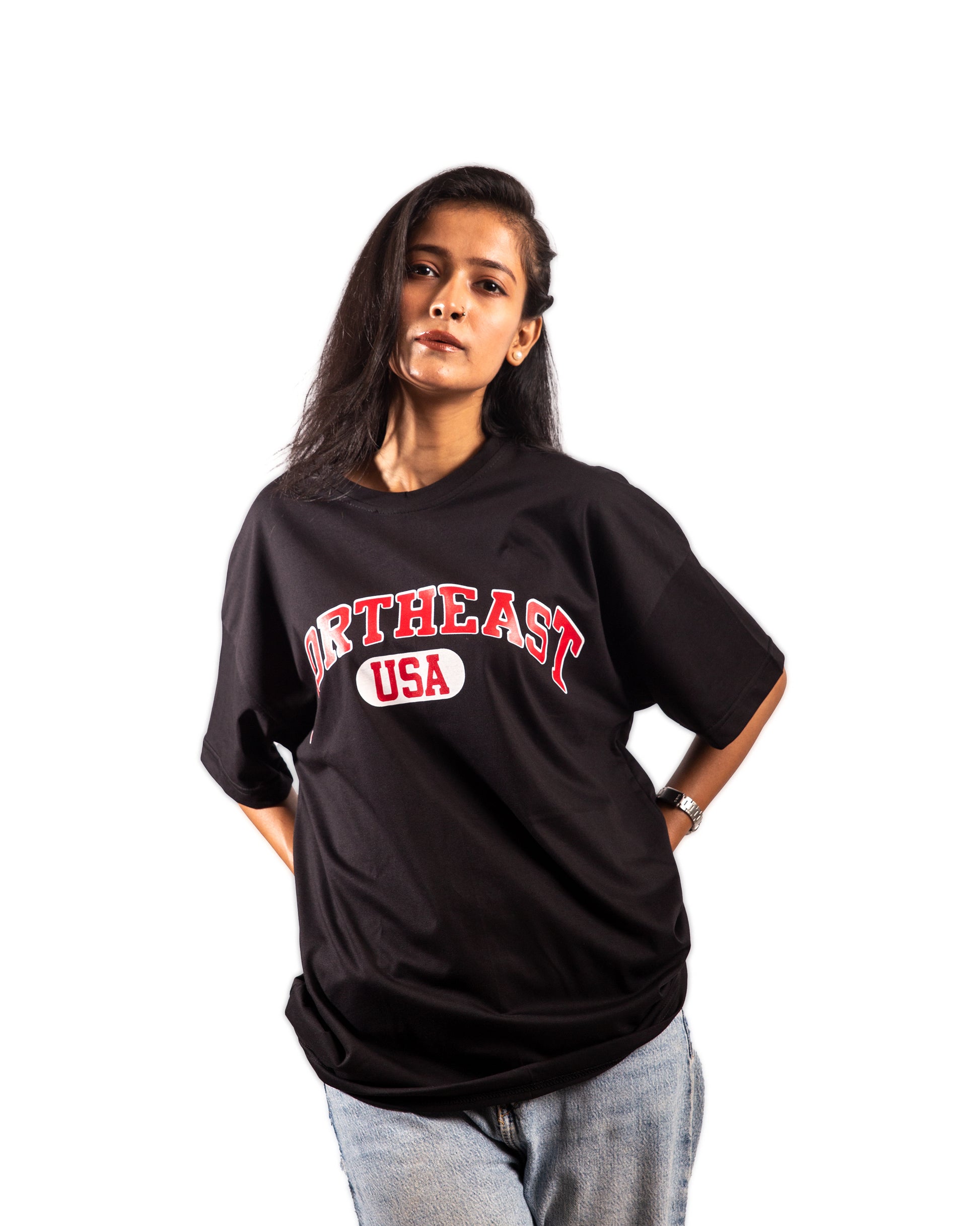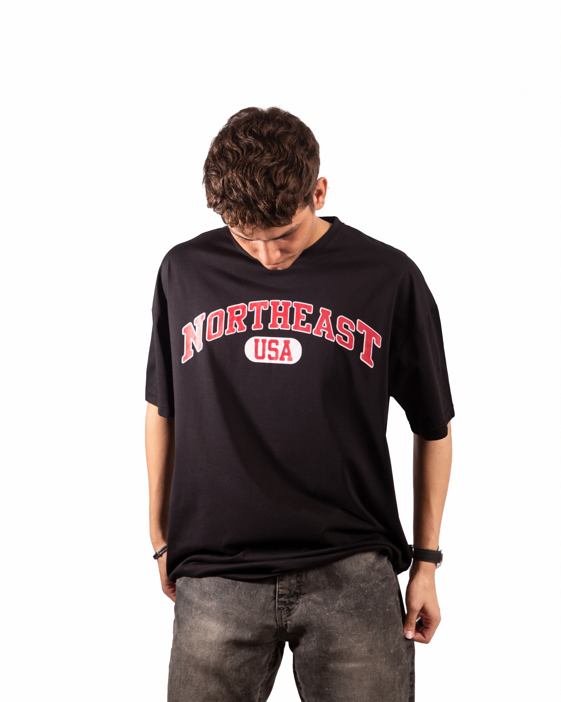 Make a bold, classic statement with the Northeast oversized t-shirt from Lazy 6. This black unisex tee features a clean and collegiate-style graphic across the chest. The word “NORTHEAST” is printed in large varsity-style red lettering with a crisp white outline, centered above a smaller “USA” emblem. It’s a timeless design that channels vintage American campus vibes with a modern oversized fit.