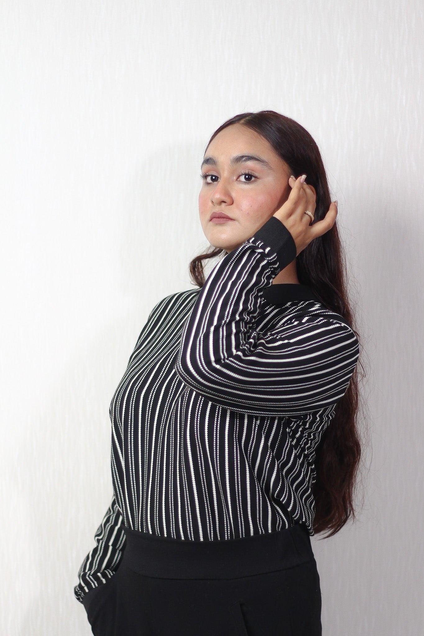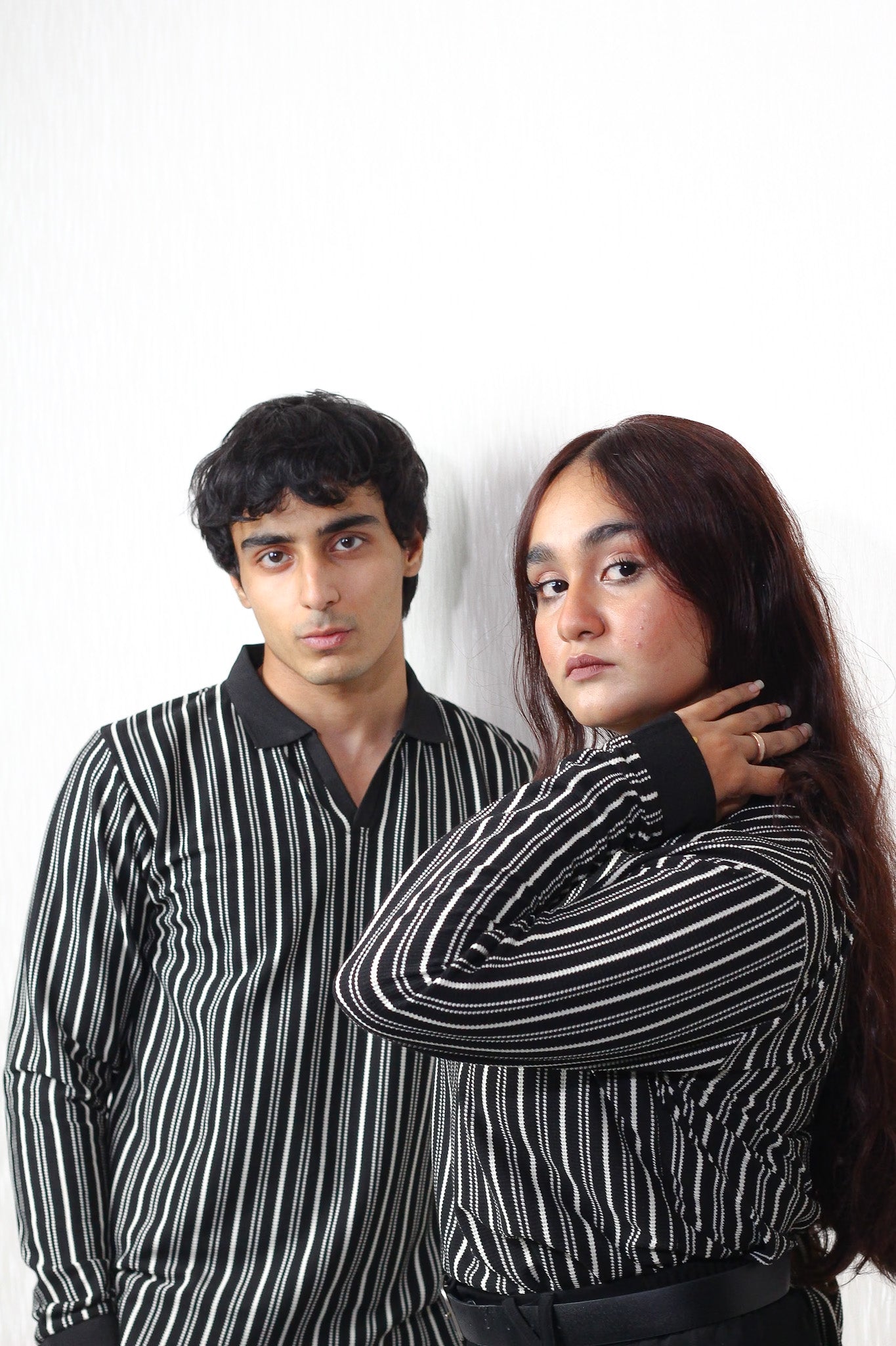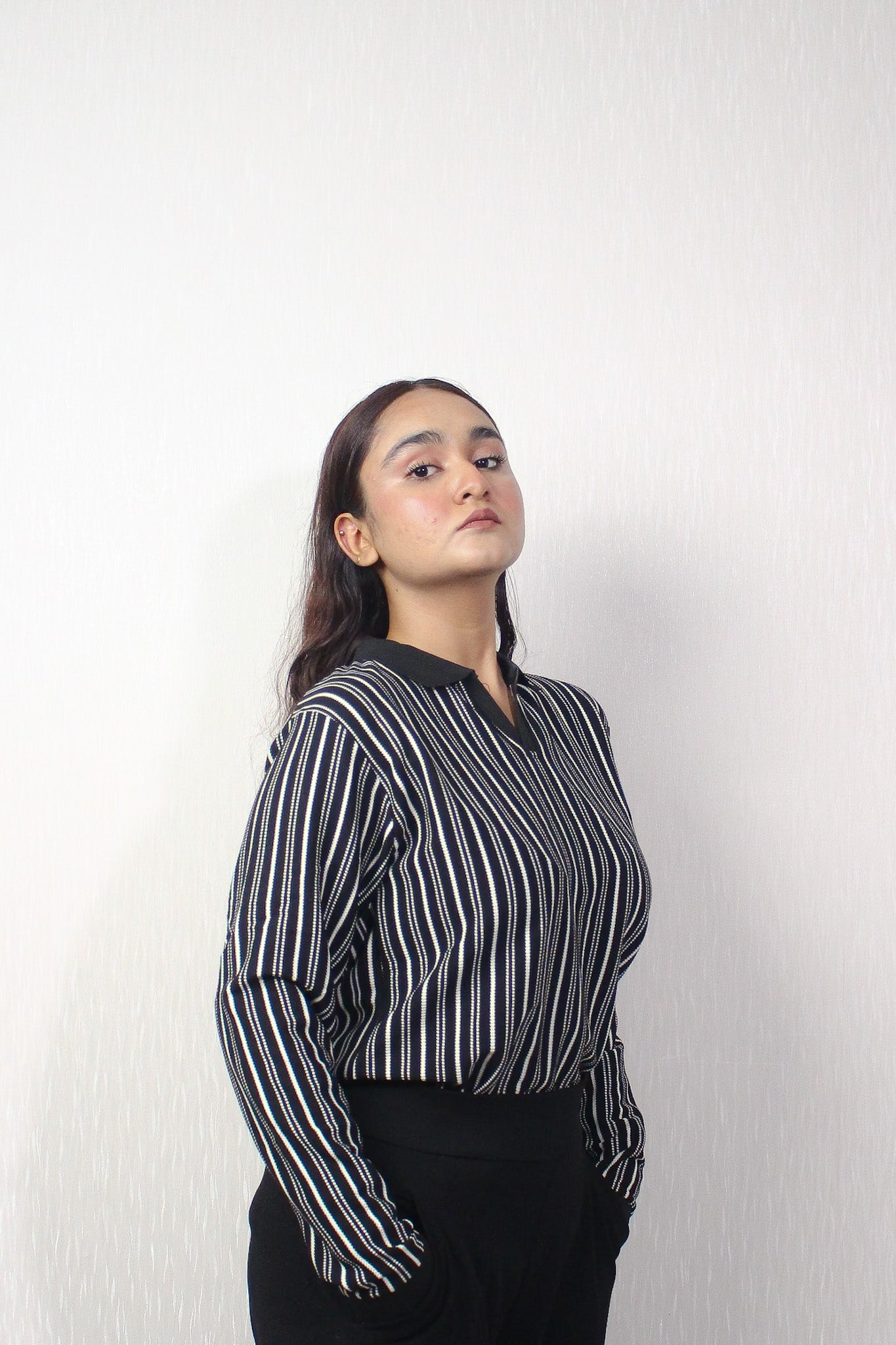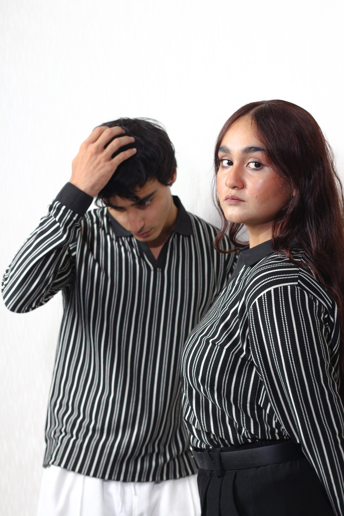 Woven from a fine, resilient knit, the garment features a hypnotic black canvas punctuated by perfectly uniform white vertical stripes. This rhythmic pattern doesn't just decorate—it elongates, creating a powerful, streamlined silhouette. The pullover is anchored by a sharp, solid black polo collar and a refined V-neck placket, blending the ease of a knit with the polish of a shirt.
