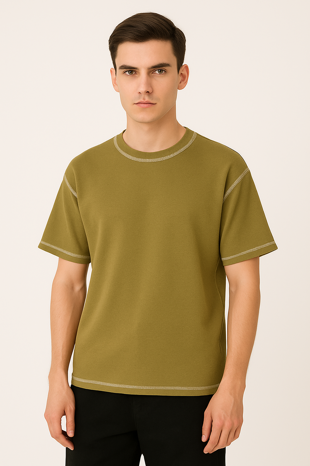 The drop shoulder design enhances the relaxed, laid-back fit, while the rugged contrast of *white thread overlays* along the seams, neck, sleeves, and hem adds just the right amount of attitude. These exposed stitches create a handcrafted, detailed look that elevates the piece beyond basic.